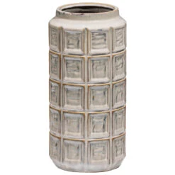 De Contain vaas 39cm van BePureHome is cilindervormig met vakkenpatroon in een groene kleurtint. De vaas heeft een diameter van 18 centimeter, een hoogte van 39 centimeter. De vaas heeft een inhoud van 38 centiliter met aan de bovenkant een opening met een diameter van 12,5 centimeter. De vakken op het patroon zijn ieder 5,5 centimeter breed, 0,1 centimeter diep en 6,5 centimeter hoog. De vaas is gemaakt van gekleurd keramiek met geglazuurde buitenkant. De vaas is uiterst hittebestendig en is geschikt voor binnen en buiten gebruik. Bij harde regenval en vorst adviseren wij de vaas naar binnen te halen. Houd de vaas schoon met een lauwwarm sopje, neutrale zeep en een zachte doek. Mocht het keramiek beschadigen kunnen krassen worden opgevuld met reparatievloeistof voor keramiek.