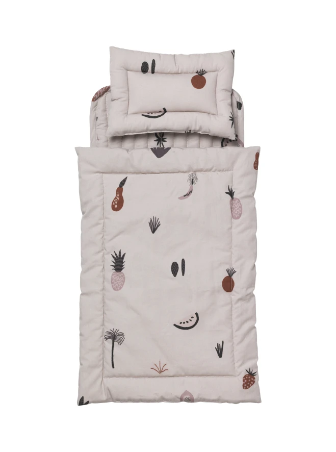Het Ferm living Kuku Doll Fruiticana beddengoed is gemaakt van organisch katoen en gerecycled polyester. Het beddengoed is 20 centimeter breed, 40 centimeter hoog en 3 centimeter diep. Het beddengoed is gemaakt voor het Kuku Doll bed.