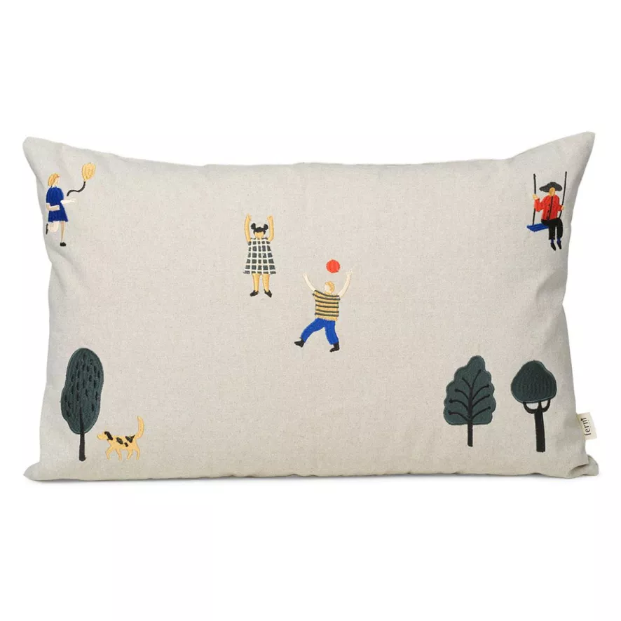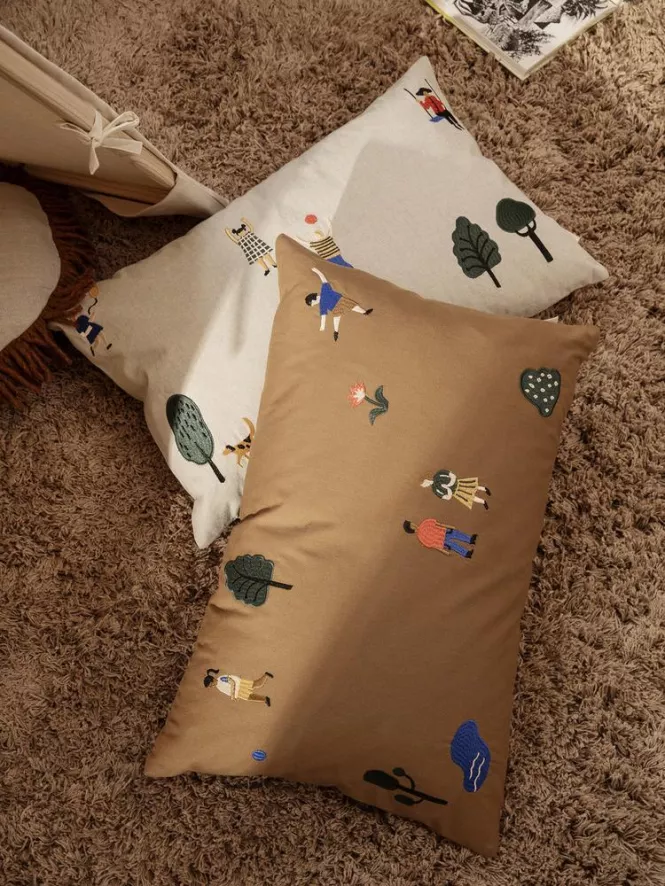 Het Park kussen van Ferm Living heeft een breedte van 60 centimeter en hoogte van 40 centimeter. De kussenhoes is gemaakt van 100% GOTS-gecertificeerd katoenen stof, bewerkt met borduursels. De vulling is gemaakt van veren en dons. Ferm Living raadt aan de kussenhoes op maximaal 30°C graden te wassen, binnenstebuiten en met de rist half gesloten.