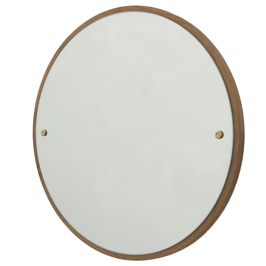 De Frama Mirror spiegel 75 cm heeft een diameter van 75 centimeter en een diepte van 1,9 centimeter. De spiegel, met schuine zijkanten, is gemaakt van diamantgeslepen glas. De eikenhouten achterplaat is tweemaal geolied om de kwaliteit te behouden, de originele houtkleur is nog goed te zien. De zichtbare schroeven aan de zijkanten zijn gemaakt van messing.