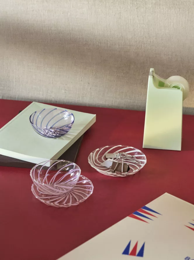 De kommen zijn gemaakt van gekleurd borosilicaatglas en zijn voorzien van een wervelpatroon.