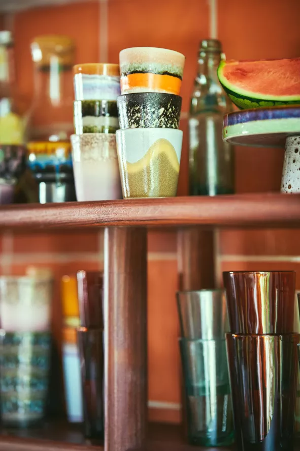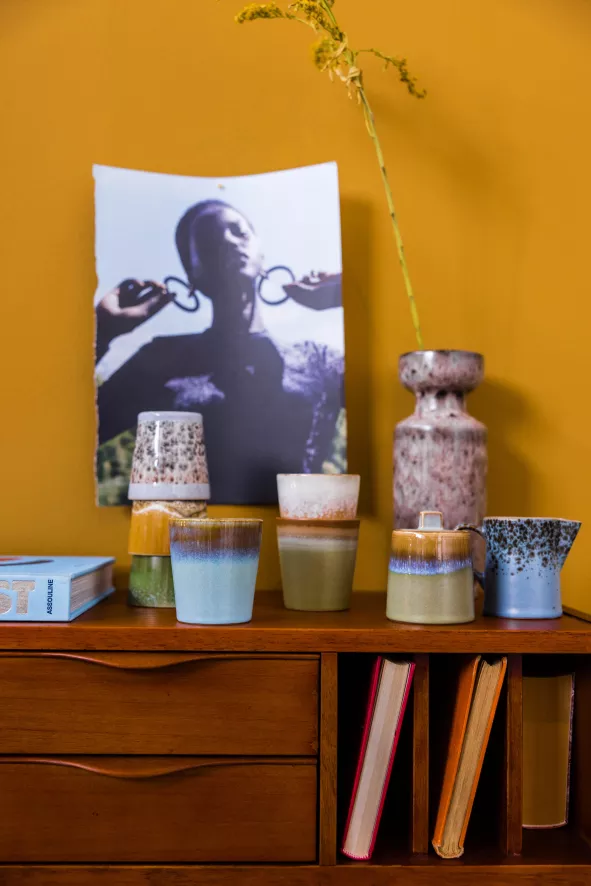 In 70’s Ceramic mokken set of 6 van HKliving zitten 6 mokken van keramiek. De mokken hebben een diameter van 7,5 centimeter en 8 centimeter hoog. Deze 70’s-collectie is geïnspireerd op de jaren zeventig en zijn stuk voor stuk handgemaakt. Daardoor is elk item uniek en heeft het een eigen karakter. De mokken zijn geschikt voor zowel de vaatwasser als de magnetron. In iedere mok kan 180 milliliter.