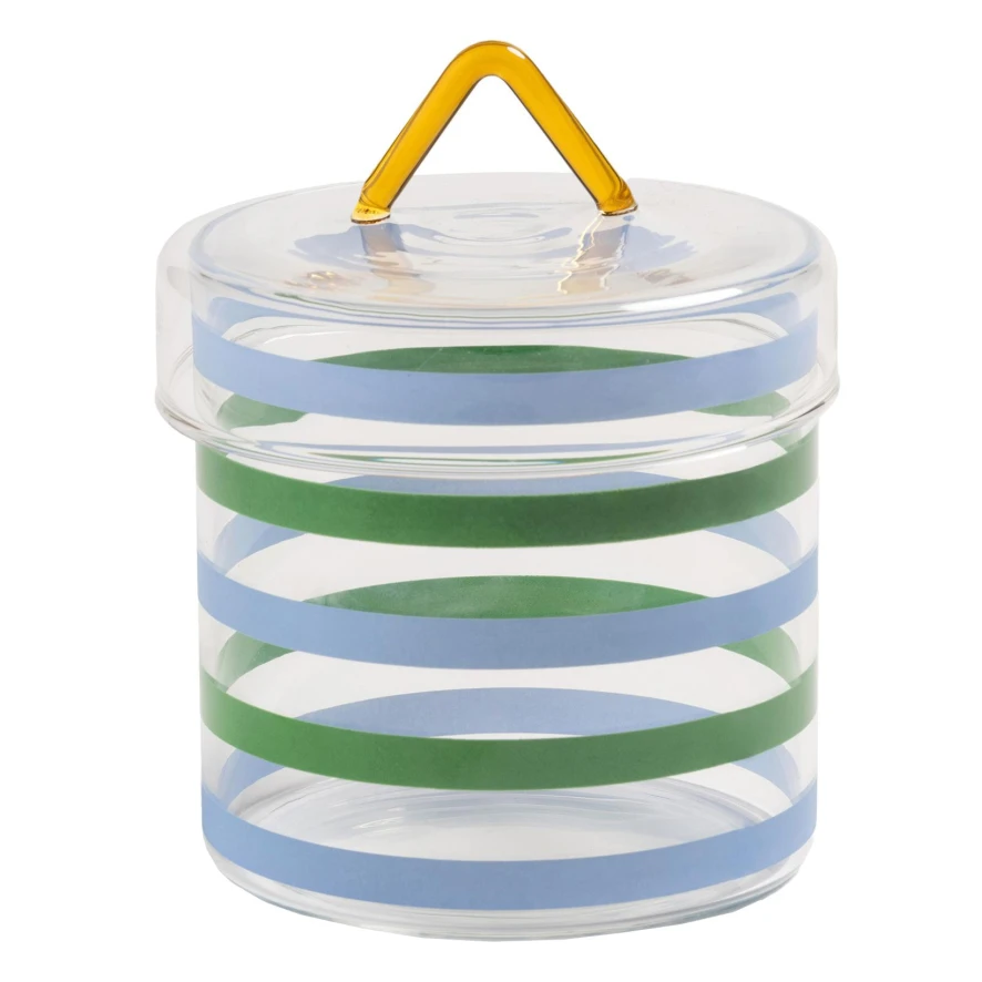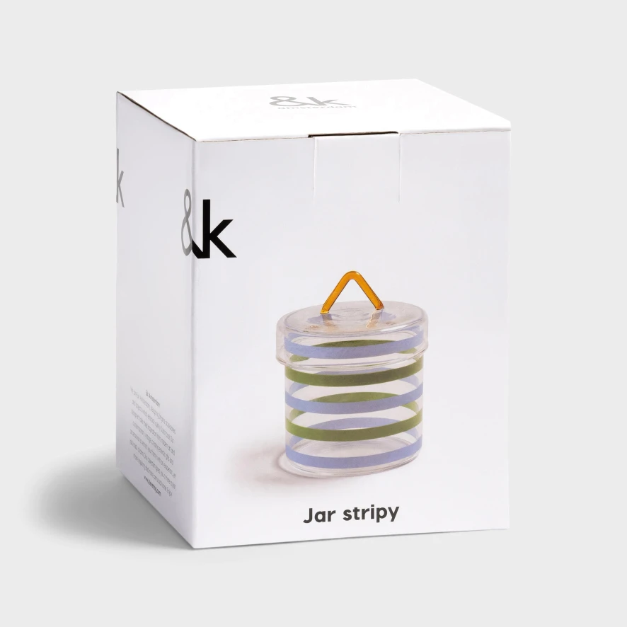 De Stripy voorraadpot medium van &Klevering heeft een diameter van 10 centimeter en een hoogte van 13 centimeter. De pot is gemaakt van glas en is voorzien van een blauw-groen streeppatroon. &Klevering adviseert de voorraadpot met de hand af te wassen.