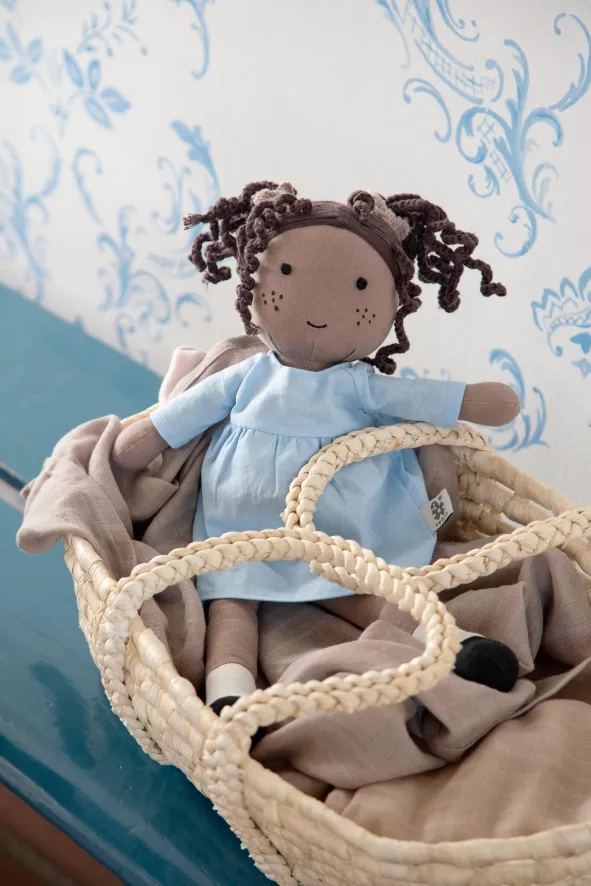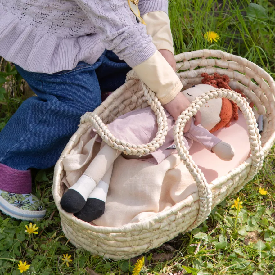 Het Moses poppenbed aankleedkussen van Sebra is 48 centimeter lang, 28 centimeter breed en 30 centimeter hoog. De mand is gemaakt van 50% maïskorrel en 50% tarwestro. Het aankleedkussen is gemaakt van 100% katoen met een polyester vulling. Haal er een doekje overheen om het schoon te maken.