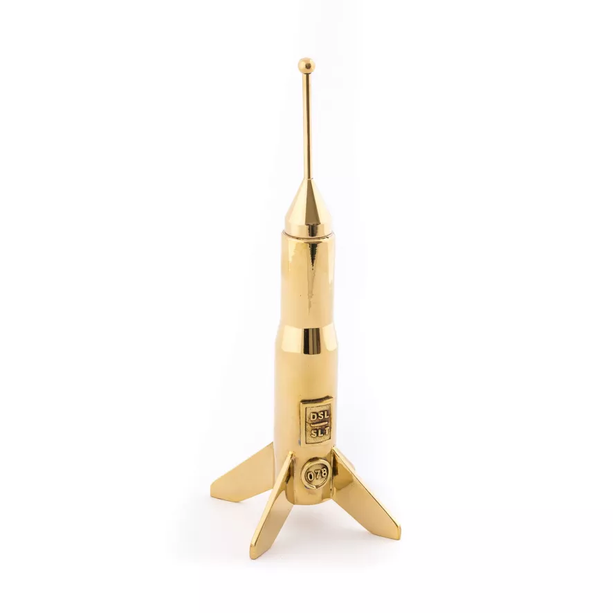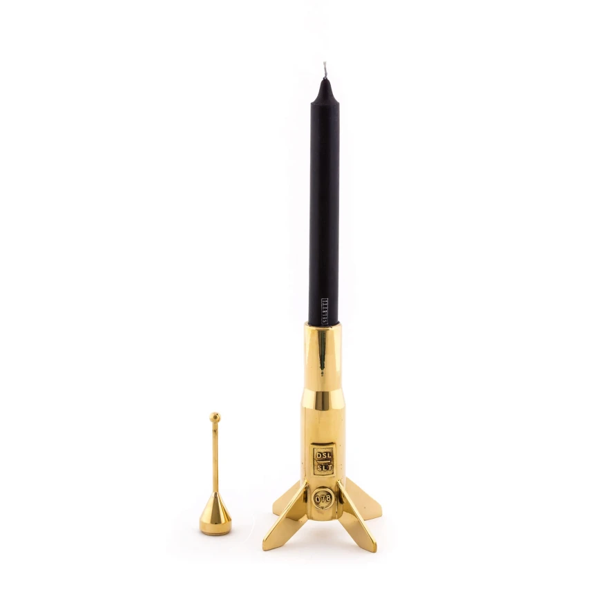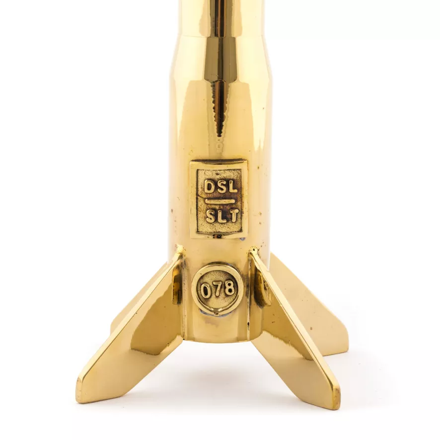 De Lunar kandelaar small van Seletti maakt onderdeel uit van de Cosmic Diner collectie. De kandelaar heeft een hoogte van 17 centimeter zonder en 28 centimeter met raketpunt. De diameter is 13 centimeter. De kandelaar heeft de vorm van een raket en is gemaakt van messing.