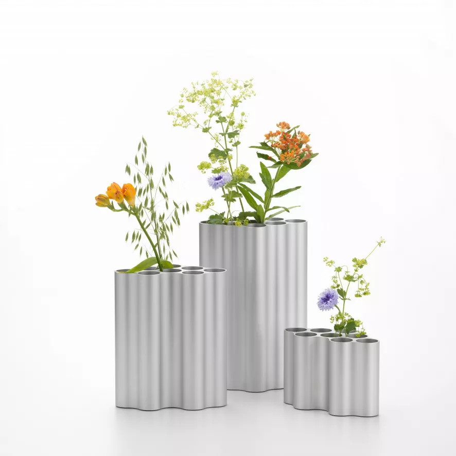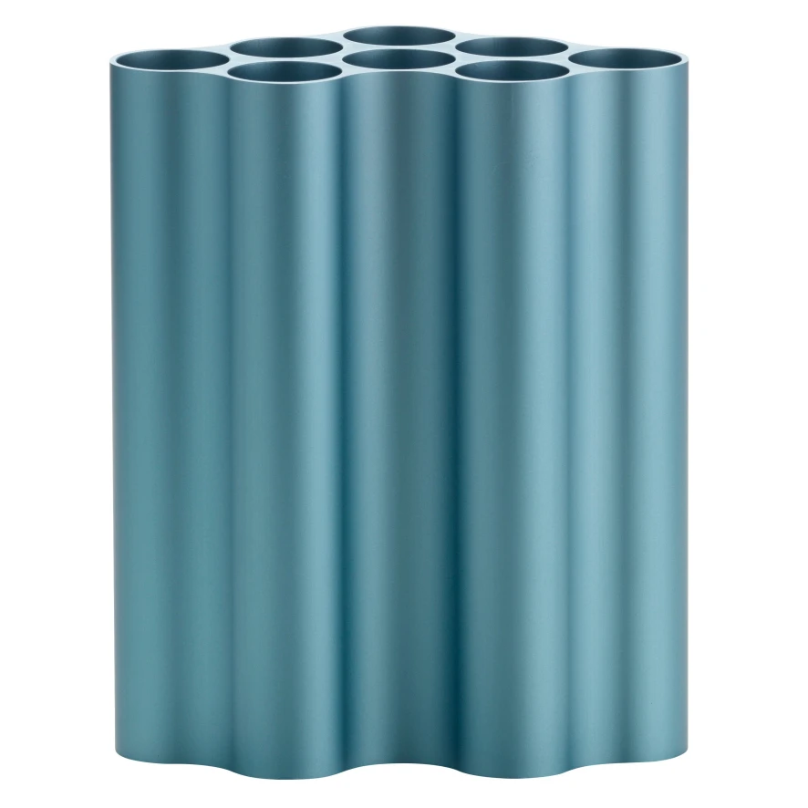 De Nuage vaas medium van Vitra is gemaakt van geadoniseerd aluminium en heeft rubberen stoppen. Je kunt voor de wolkvormige vaas kiezen uit de kleuren Ivy, Light Silver, Pastel Blue en Steel Blue. De vaas maat medium heeft een lengte van 19,5 centimeter, een breedte van 11 centimeter en een hoogte van 24 centimeter. De vaas is ook beschikbaar in de maten small en large. Onderling kun je de verschillende maten en kleuren goed met elkaar combineren.